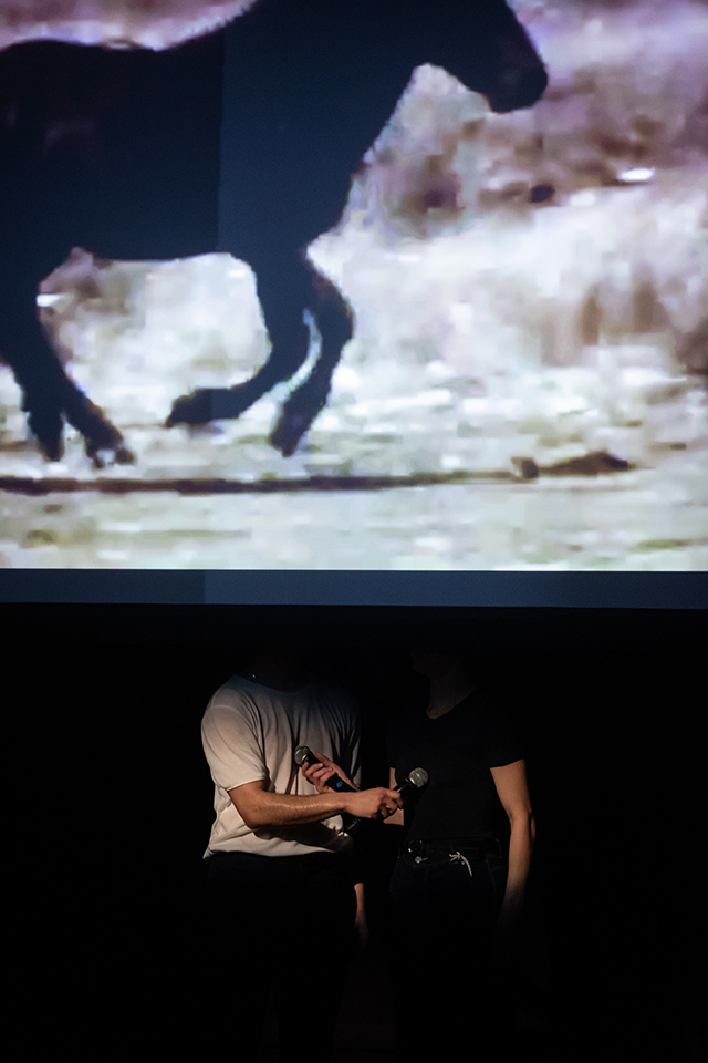 Within the scenic formulation, individual pieces of information are teased out of the reused materials, thus inviting audience members to generate new connections and interrelations. They find themselves successively transformed into listeners of a makeshift and heterogeneous soundtrack that unfolds before them. The performers become the intermediaries between archive and audience, offering up their own personal takes, composing their own sound adaptation of a non-linear cinematic script, and choosing, at the end of the day, what could possibly be heard.