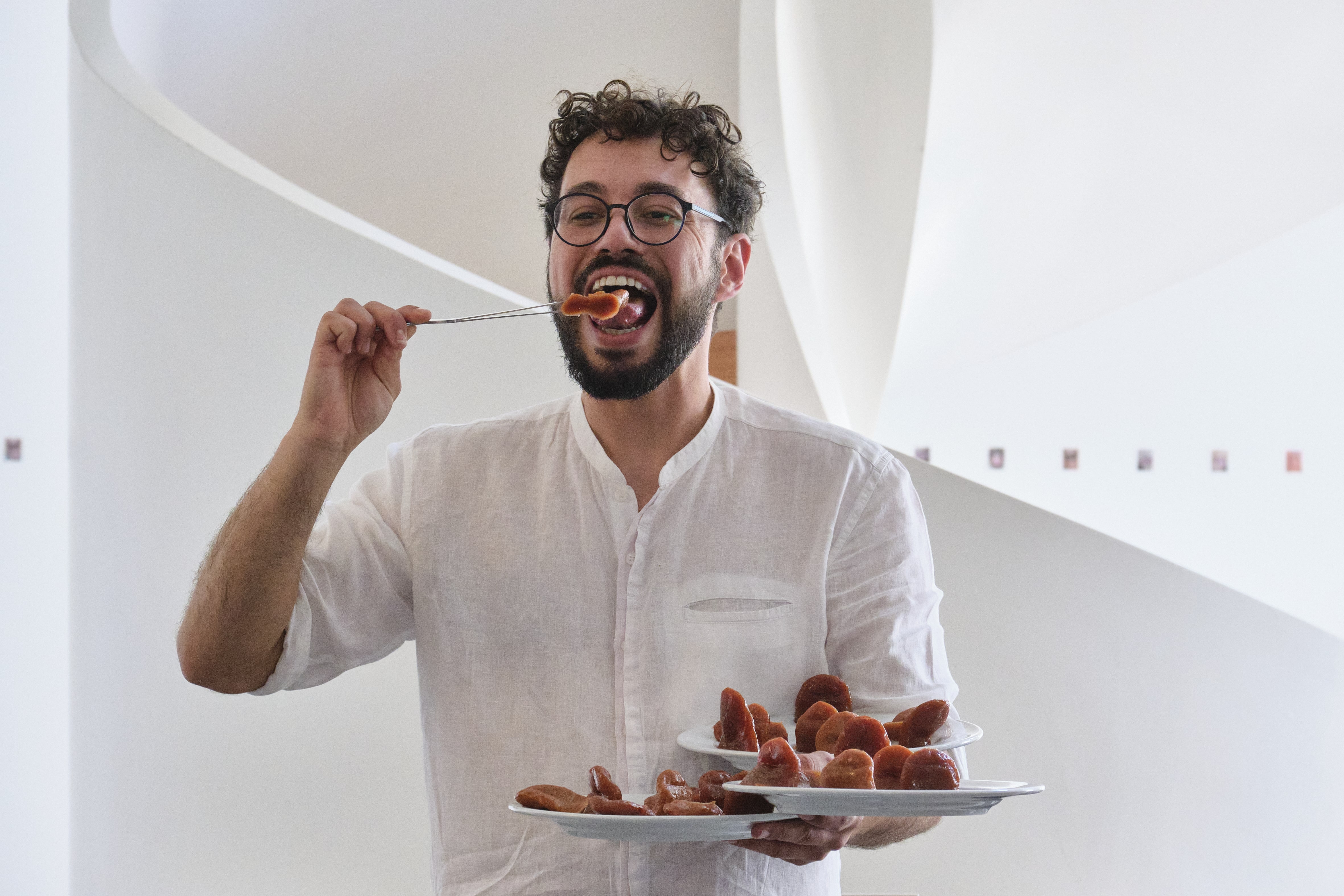 Eduardo Freitas nasceu em Ponta Grossa - PR, Brasil (1990). Em 2017, mudou-se para Portugal em busca de estímulos para o seu processo criativo. Actualmente, é doutorando em Arte Contemporânea na Universidade de Coimbra (bolseiro FCT) e mestre em Práticas Artísticas em Artes Visuais pela Universidade de Évora (2019). No Brasil, licenciou-se em Escultura pela Escola de Música e Belas Artes do Paraná (2012) e especializou-se em Poéticas Visuais (2014). Paralelamente aos seus estudos artísticos, trabalhou e integrou-se na indústria da restauração, experiência que influencia a sua abordagem à comida, aos rituais comensais, à hospitalidade e ao acto de comer e cozinhar como parte da sua prática artística. A sua produção explora linguagens híbridas que dialogam com os conceitos de corpo, trabalho e materialidade, por meio de “acções escultóricas” que estreitam a relação entre o público e a prática artística, conectando vivências pessoais a memórias e histórias colectivas. Participou em diversas exposições, incluindo Natureza-Morta (Appleton Box, Lisboa, 2024), Empregado de Mesa (XXIII Bienal Internacional de Arte de Cerveira, 2024), Planta de Emergência (Montemor-o-Novo, Évora, São Gregório e Vila Real, 2024), En.talho (Galeria Municipal de Montemor-o-Novo, 2024), Em.prego (La Junqueira Artists Residency, Lisboa, 2022) e Tracing the Infrathin (Galeria Monitor, Lisboa, 2022). No Brasil, foi seleccionado para a Mostra Bienal Caixa de Novos Artistas (2016), que percorreu sete capitais do país. O seu trabalho recebeu prémios nacionais e internacionais, como a Bienal Jov’Arte 2023 (Loures), 24.º Salão de Arte de Praia Grande (SP), 45.º Salão de Arte Luiz Sacilotto (SP), 48.º Salão de Arte Contemporânea de Piracicaba (SP), 5.º e 4.º Salão Nacional de Cerâmica (PR), o 4.º Salão Nacional de Arte de Jataí (GO), o 3.º SESI Arte Contemporânea (PR), entre outros. Também realizou diversos projectos de residências artísticas, destacando-se a sua colaboração contínua com a Associação Pó de Vir a Ser (Évora).